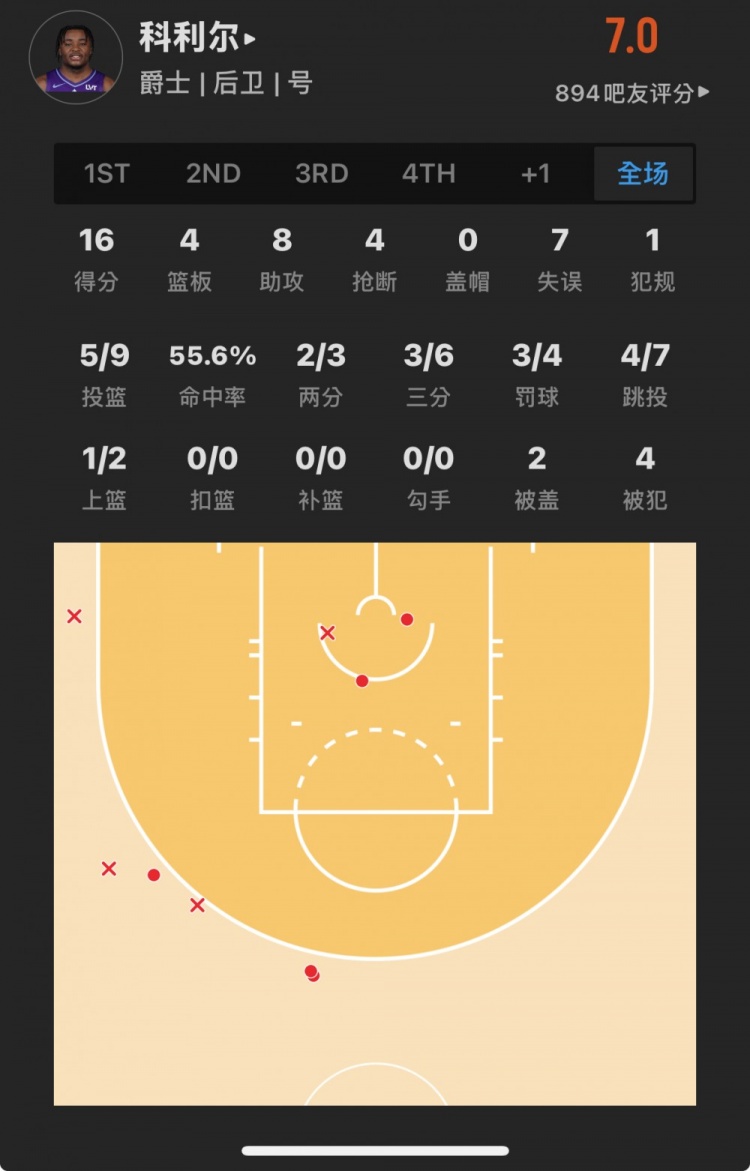 菜鸟丨爵士32号秀20分10板 科利尔16+4+8+4断 热火中锋韦尔17+9