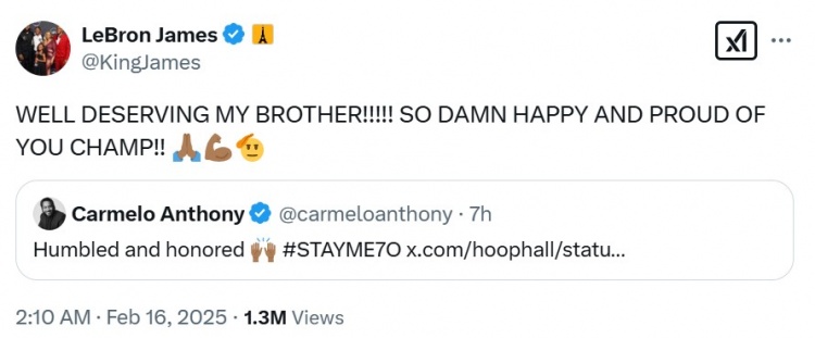 勒布朗-詹姆斯转发评论道:“我的兄弟实至名归!!!!!我TMD太为你这位冠军感到高兴和骄傲了????????????????????!!”