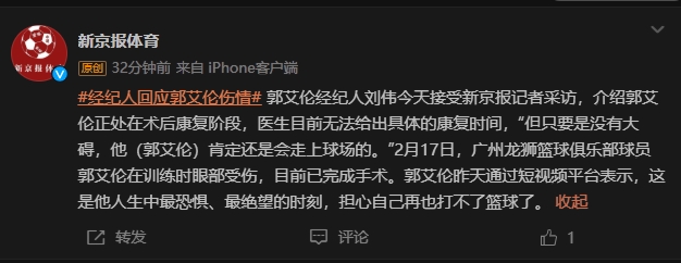 经纪人回应郭艾伦伤势:正处康复阶段 医生无法给出具体康复时间