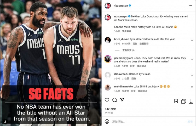 美媒NBAonESPN:“欧文和独行侠本赛季都没有入选全明星,独行侠能创造历史吗?”