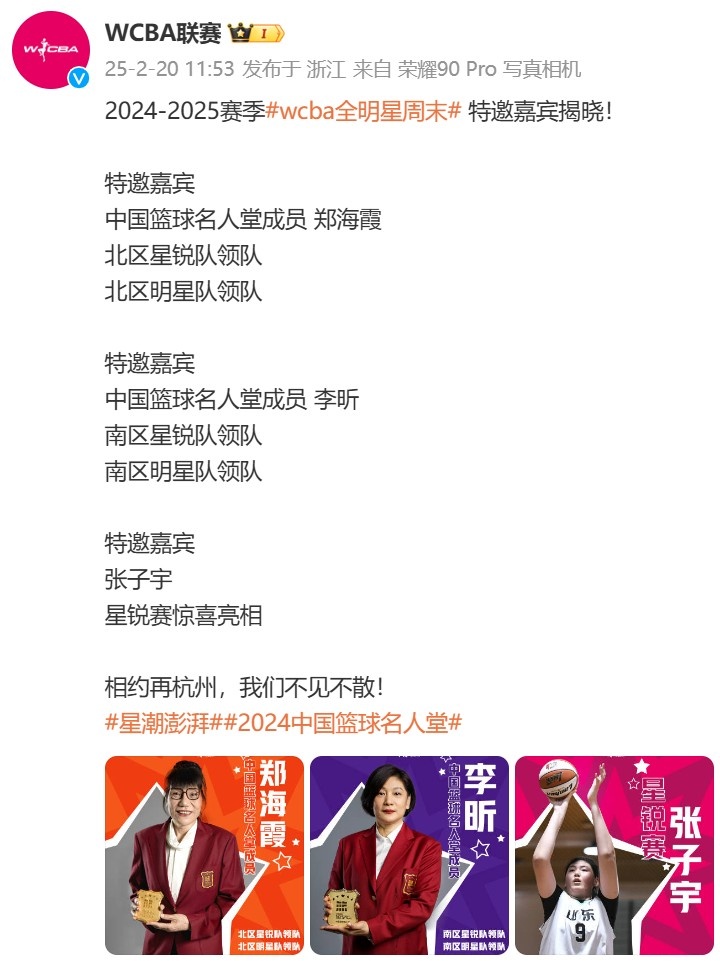 WCBA联赛官方微博发文公布了三位特邀嘉宾,分别是郑海霞、李昕和张子宇,原文如下: