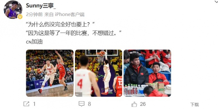 今日,廖三宁更博:“为什么伤没完全好也要上?因为这是等了一年的比赛,不想错过。加油。”