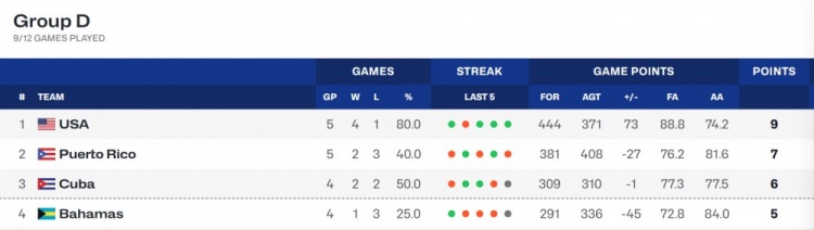 目前,美国男篮4胜1负积9分,暂时排在D组第一。