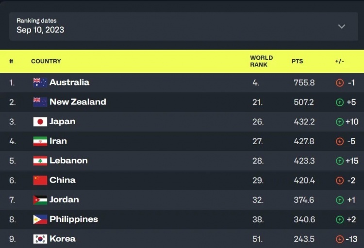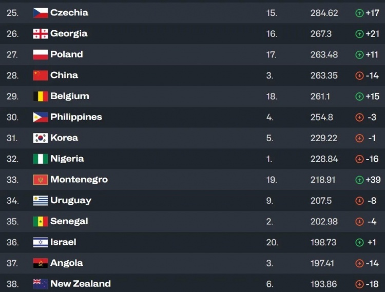 接着,你还要看看对手的世界排名,据此加上第三个项,公式为1.5*(世界排名平均数-对手排名),这蕴含着击败越强对手获益越多、输给越弱对手惩罚越重的理念。2023年状态强劲的拉脱维亚,曾短期内连续掀翻西班牙、法国、希腊在内的多支排名高于自己的强队,世界杯正赛上更是大胜巴西立陶宛喜提第五,藉此排名从29名暴涨到前八。