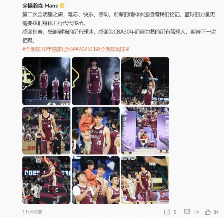 杨瀚森配文:“第二次全明星之旅,难忘、快乐、感动。前辈的精神永远值得我们铭记,篮球的力量更需要我们身体力行代代传承。感谢长春,感谢到场的所有球迷,感谢为CBA30年而努力着的所有篮球人,期待下一次相聚。”