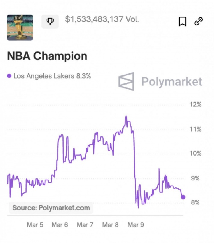 赛后美媒Polymarket更新了湖人的夺冠概率——8.3%。