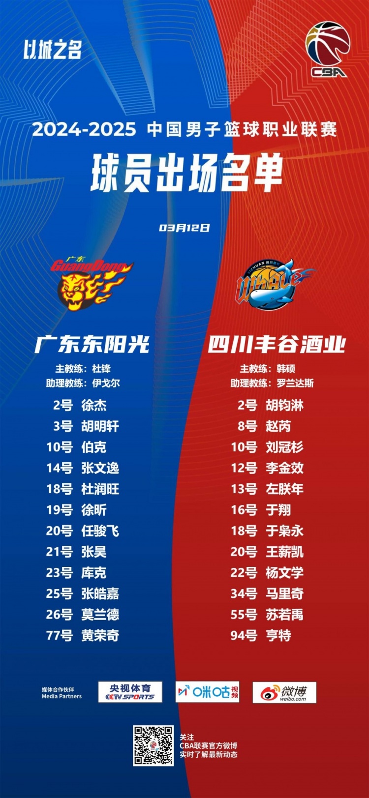 3月12日讯 CBA常规赛,广东主场对阵四川,赛前双方公布了本场比赛的大名单。