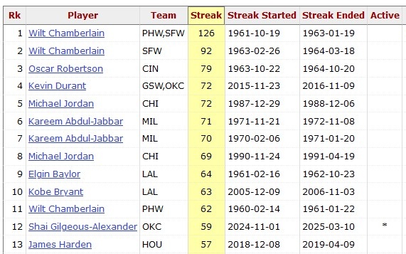 据统计,这是亚历山大连续第60场比赛砍下20+,他也成为NBA历史上第8个做到这点的球员。另外7人分别为:张伯伦、奥斯卡-罗伯特森、杜兰特、乔丹、贾巴尔、埃尔金-贝勒、科比。