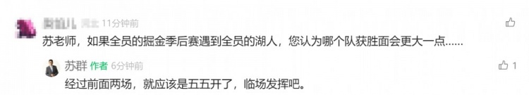 网友在苏群公众号评论区评论道:“苏老师,如果全员的掘金季后赛遇到全员的湖人,您认为哪个队获胜面会更大一点……”