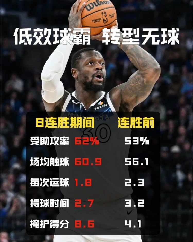此前,兰德尔每次触球要运2.31次,并且球要在他手里停留平均3.29秒。而在开启连胜后,兰德尔在触球次数增加的前提下,这两项数据分别减少至1.76和2.69。
