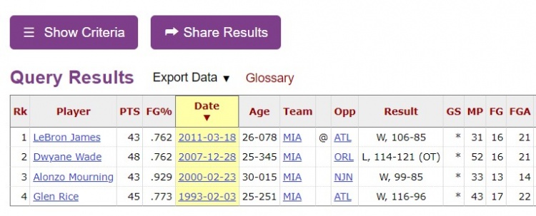 以至少75%命中率砍下40+,在热火队史上是第5次。前四次是格伦-莱斯、莫宁、韦德和詹姆斯。