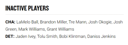 值得一提的是,黄蜂今天就有比赛,他们以102-112不敌活塞。马威没有被激活,缺席了本场比赛。