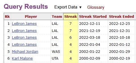 詹姆斯(4次,最多连续7场),乔丹、马龙。