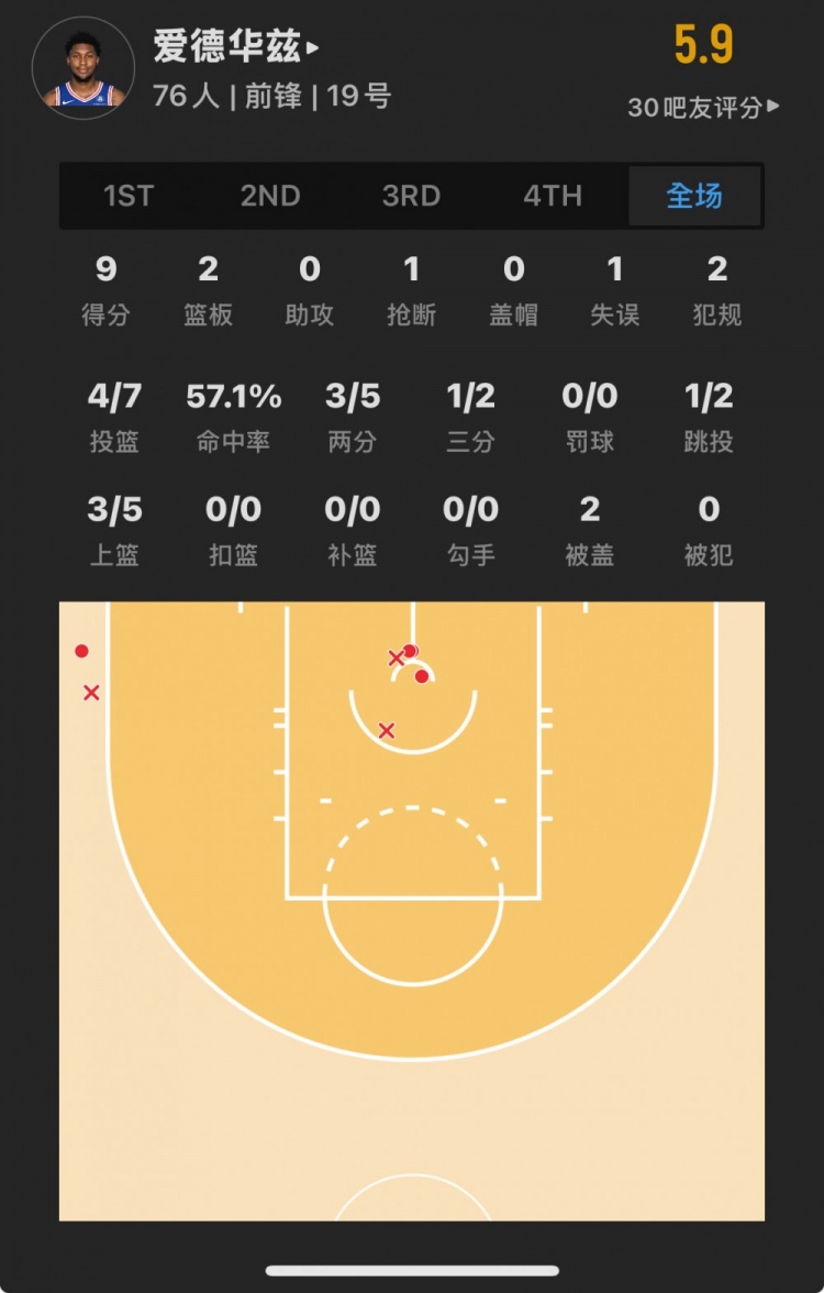 76人落选秀 贾斯汀-爱德华兹 登场16.2分钟
