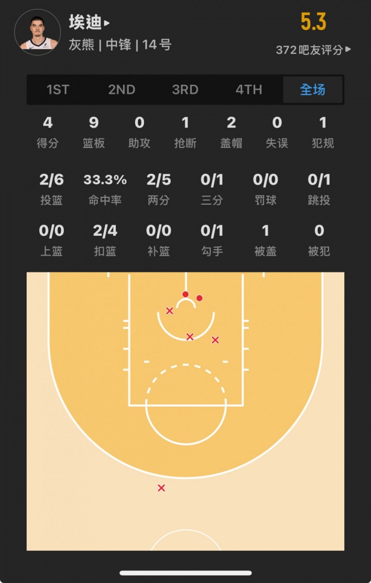 灰熊9号秀 扎克-埃迪 登场19.7分钟
