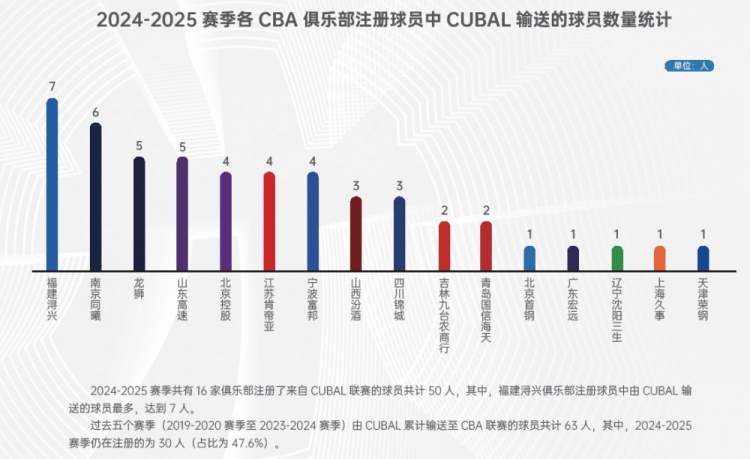 其中,本赛季各俱乐部中CUBAL输送球员的统计情况如下。福建有7人最多、同曦6人第二,广州和山东各5人。