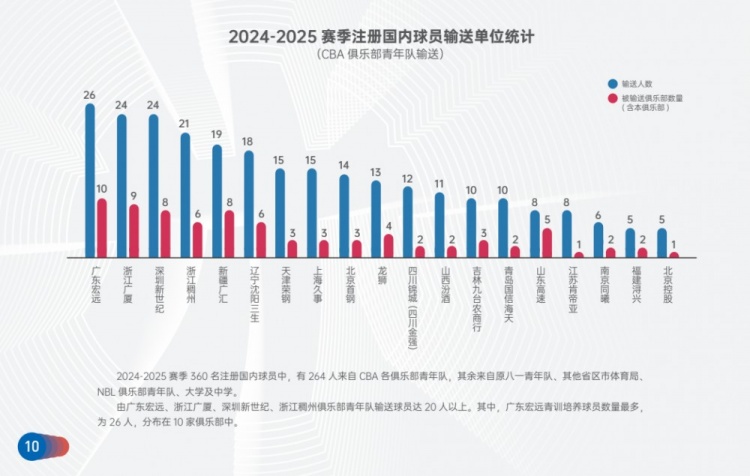 2024-2025赛季 360 名注册国内球员中,有264人来自CBA各俱乐部青年队,其余来自原八一青年队、其他省区市体育局、NBL俱乐部青年队、大学及中学。