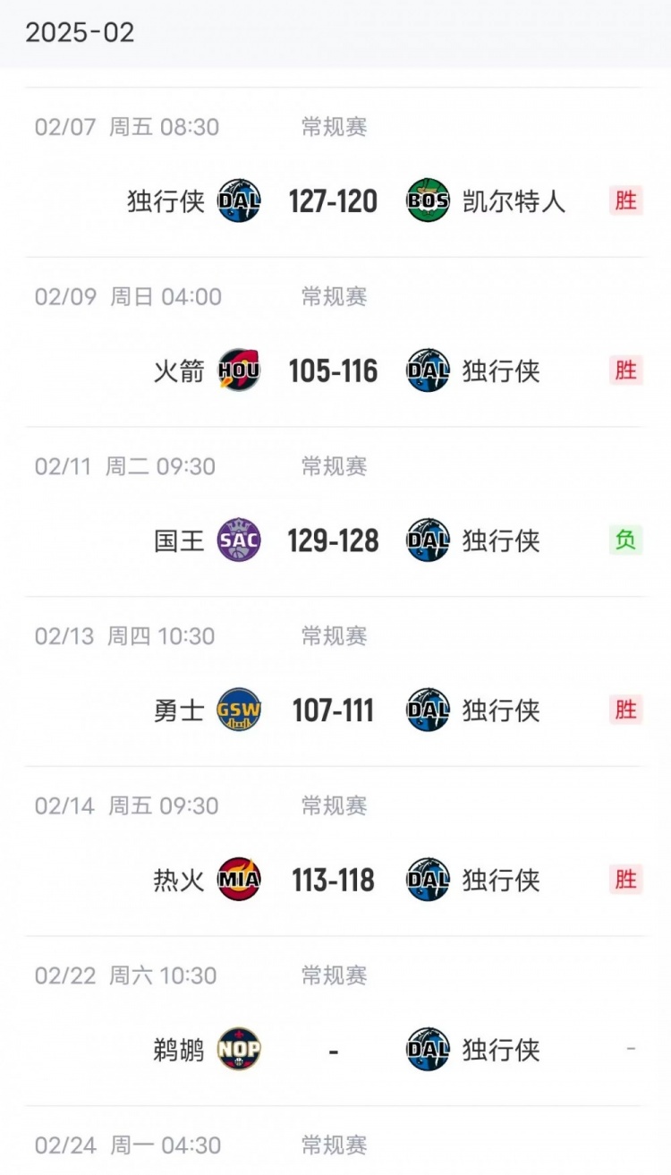 据统计,最近5场比赛,独行侠取得了4胜1负,唯一输球是加时不敌国王。