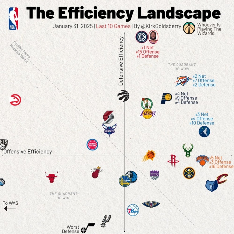近10场攻防:快船防守独一档&净效率第1 湖人攻守均衡 勇士守弱 横轴代表进攻效率、纵轴代表防守效率 2025/02/01