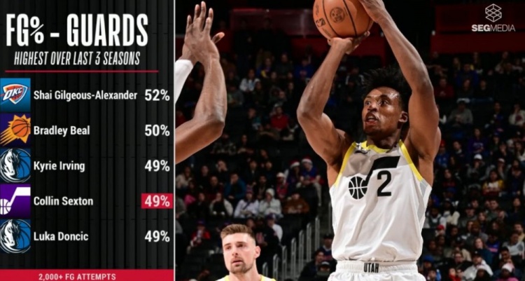 近三季出手2000+命中率Top5后卫:SGA52%高居榜首 塞克斯顿第四 1月31日讯 NBA常规赛,爵士和森林狼的比赛正在进行中。转播方给到一组数据,在最近的三个赛季中,投篮命中率(出手至少2000+)Top5的后卫如下:1、亚历山大:52%2、比尔:50%3、欧文:49 2025/01/31