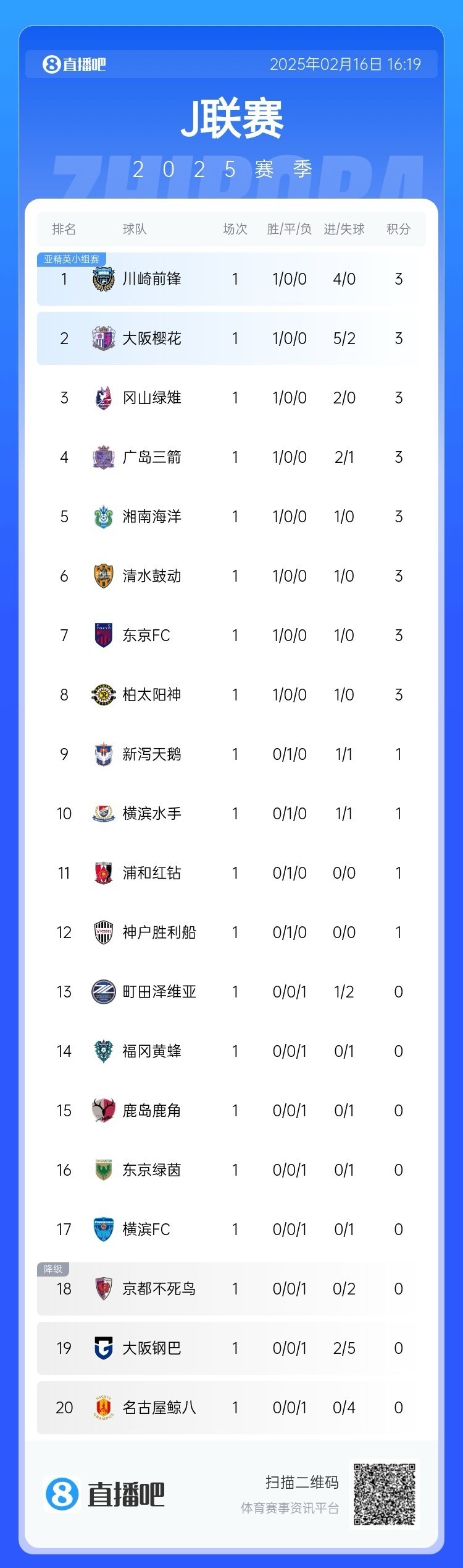 新赛季J1首轮情况:大阪樱花5-2大阪钢巴,川崎前锋4-0名古屋鲸八