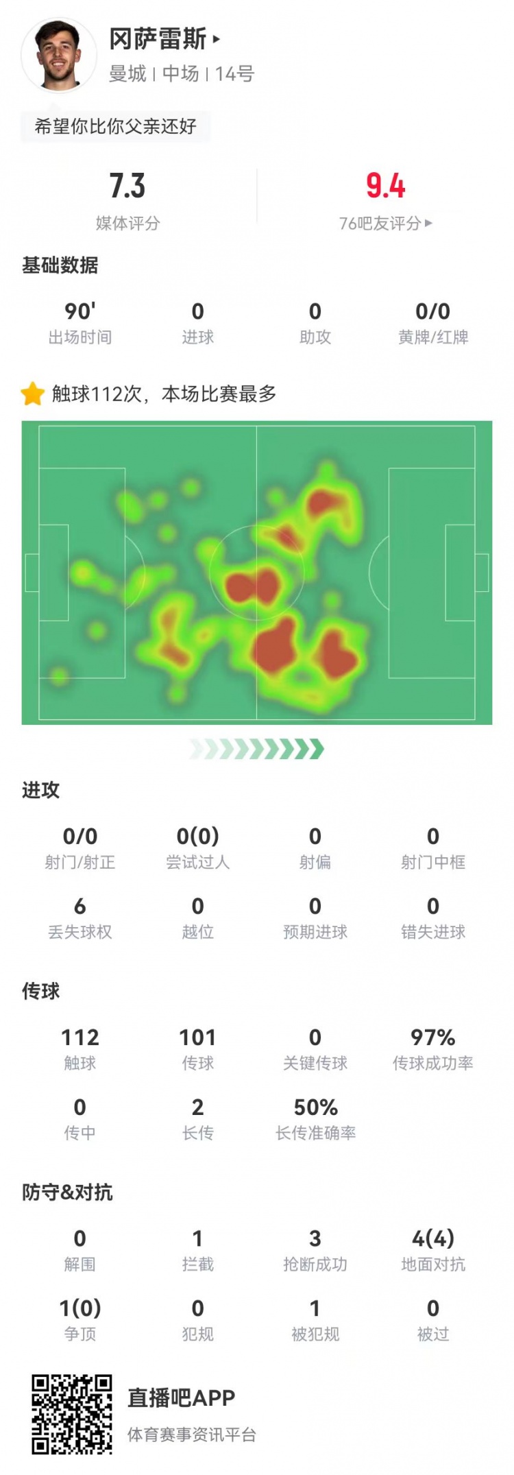 冈萨雷斯本场比赛触球达到112次,是全场最多的球员。他的传球成功率也有97%,同样是全场最高。在防守端他也有着1拦截3抢断和4次对抗全成功的战绩,仅有争顶失败一次。