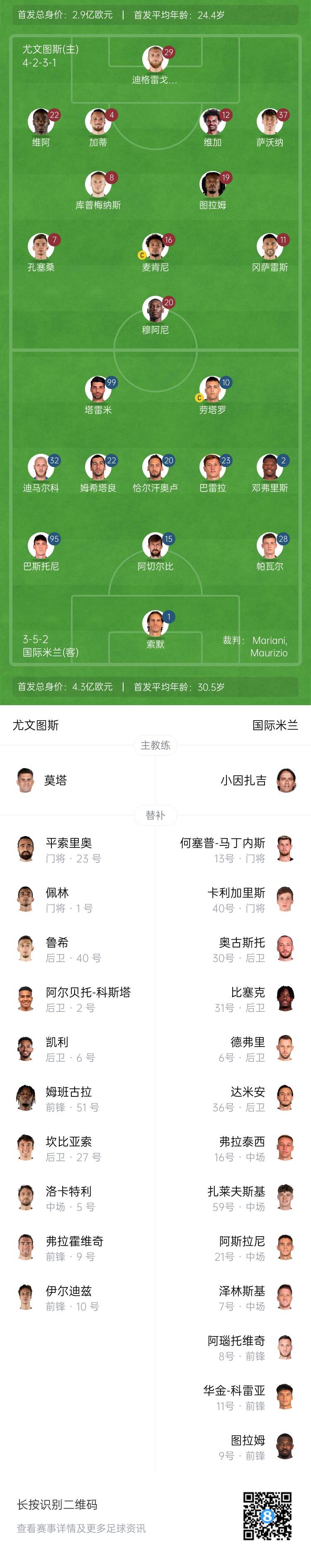 尤文替补:1-佩林、23-平索里奥、2-阿尔贝托-科斯塔、5-洛卡特利、6-凯利、9-弗拉霍维奇、10-伊尔迪兹、27-坎比亚索、40-鲁希、51-姆班古拉