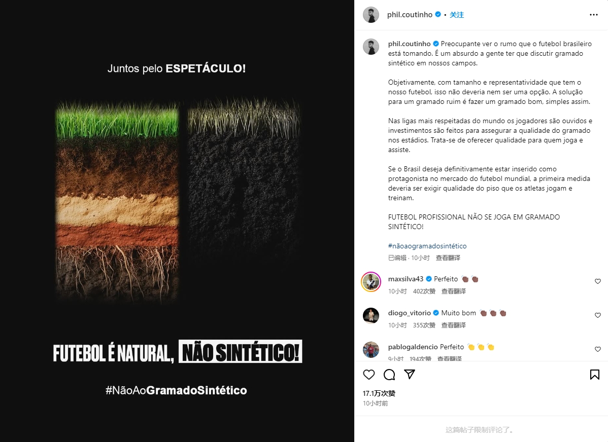 02月19日讯 内马尔、库蒂尼奥、蒂亚戈-席尔瓦等人社媒发布相同的长文,对巴西足球球场使用人工草皮进行批评。