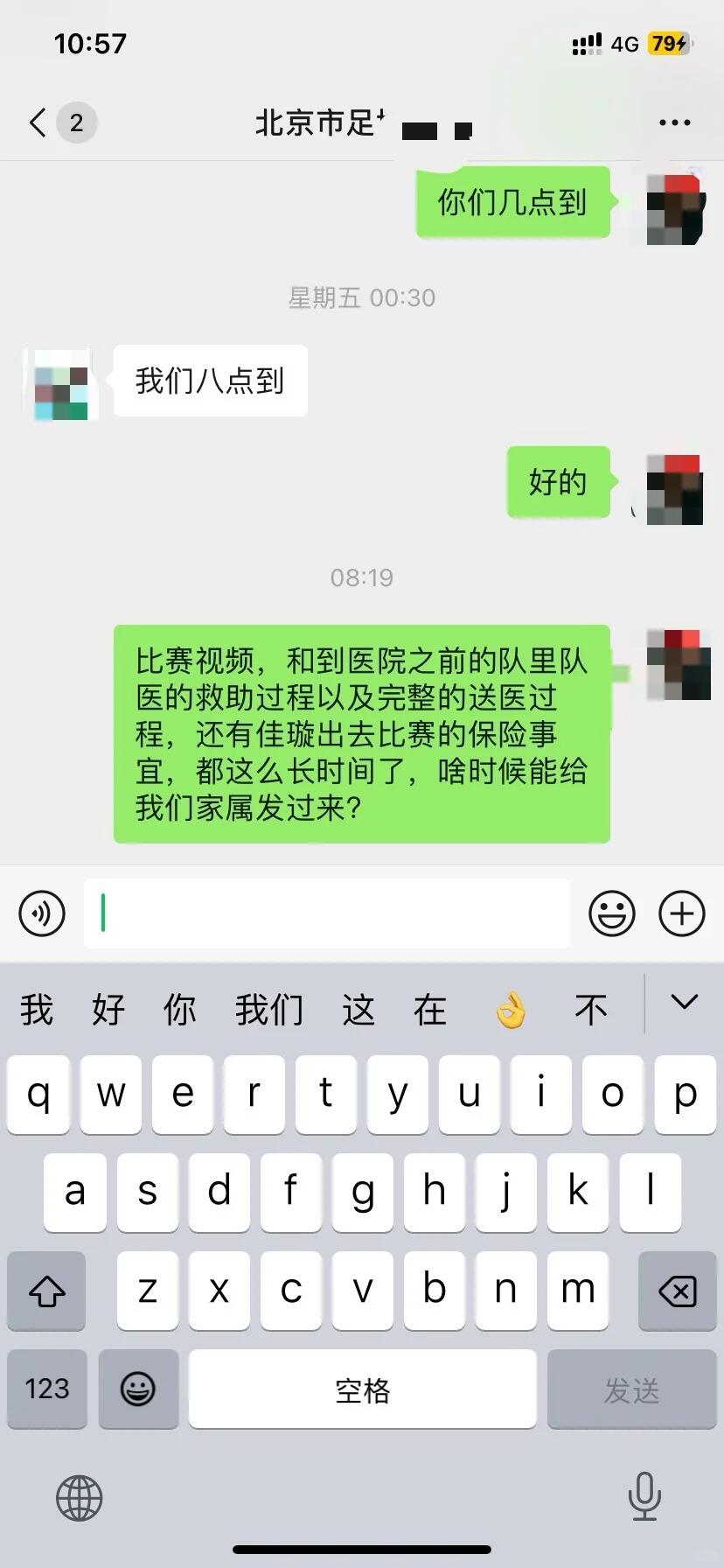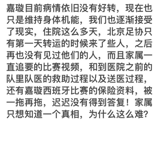 嘉璇目前病情依旧没有好转,现在也只是维持身体机能,我们也逐渐接受了现实,住院这么多天,北京足协只有第一天转运的时候来了些人,之后再也没有见过他们的人,而且家属一直追要的比赛视频,和到医院之前的队里队医的救助过程以及送医过程,还有嘉璇西班牙比赛的保险资料,被一拖再拖,迟迟没有得到答复!家属只想知道一个真相,为什么这么难?