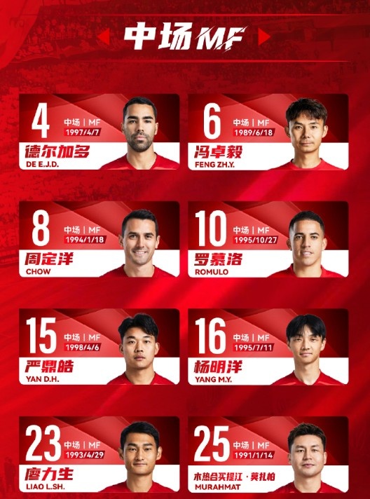 中场:4-德尔加多、6-冯卓毅、8-周定洋、10-罗慕洛、15-严鼎皓、16-杨明洋、23-廖力生、25-木热合买提江-莫扎怕、20-木塔力甫-依明卡日、39-甘超、58-廖荣祥