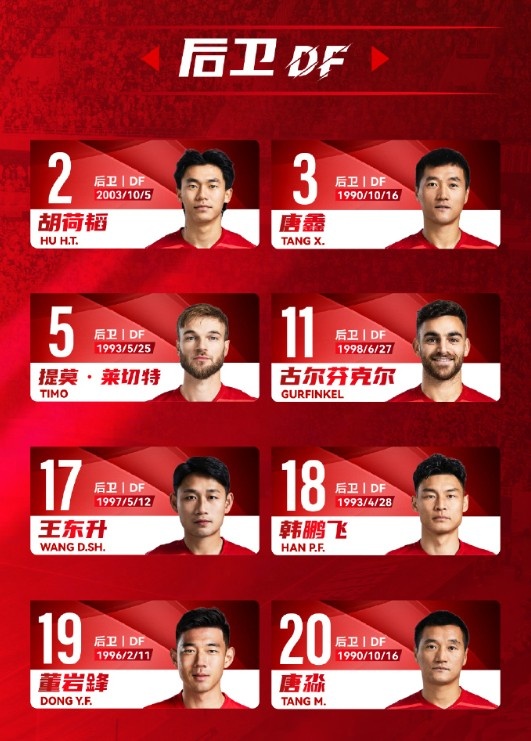 前锋:7-韦世豪、9-费利佩、24-唐创、41-艾比布拉-努尔阿吉、45-艾孜买提-凯萨尔、47-伊萨-卡隆、48-李漠雨