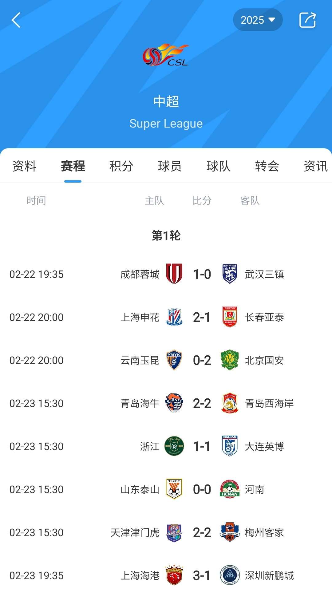 中超首轮赛果: