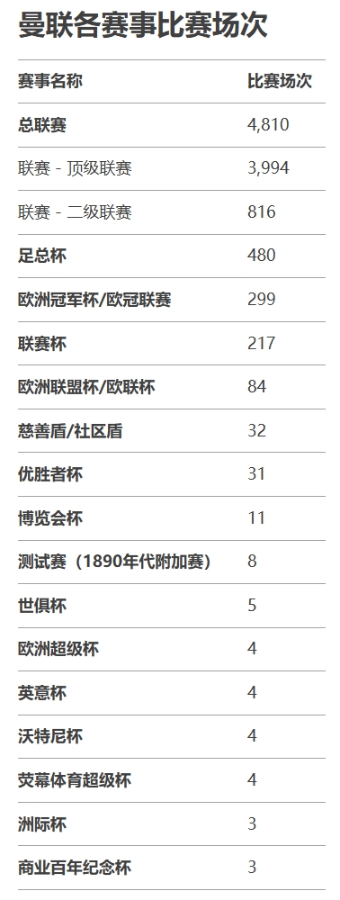 曼联这5999场比赛中,超过4800场为联赛,480场为足总杯,299场为欧冠及其前身,此外还包括各类杯赛。