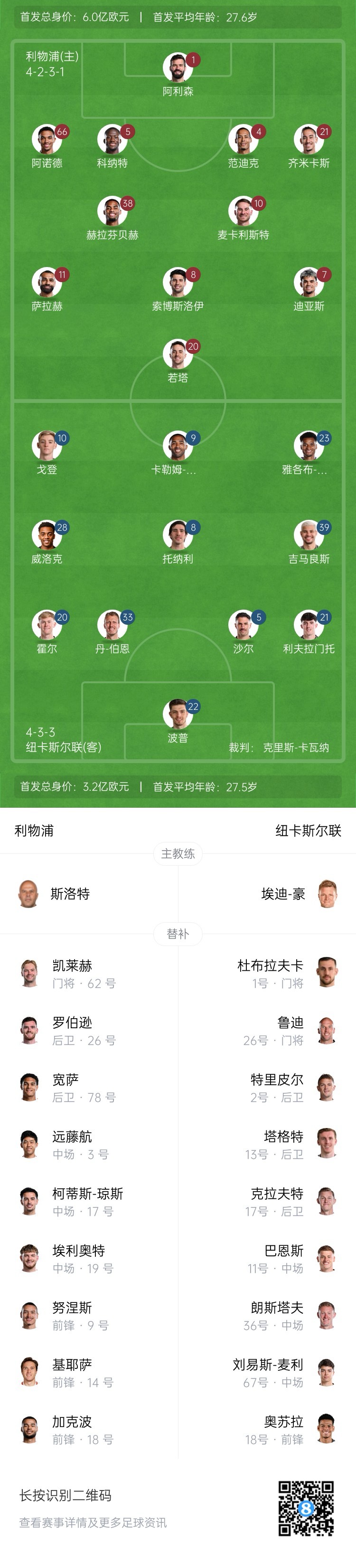 利物浦vs纽卡首发:萨拉赫、若塔、迪亚斯先发,索博出战