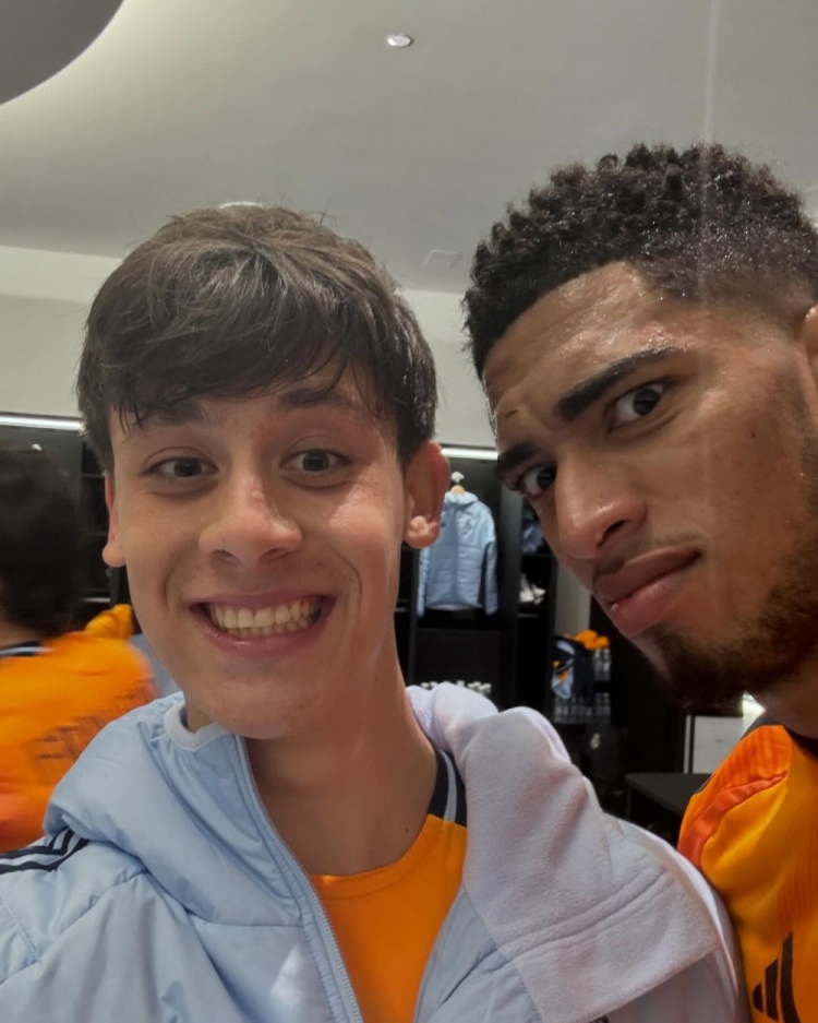 卡马文加晒出自己与维尼修斯的合照并写道:“和队长维尼修斯(后面还有莫德里奇、巴斯克斯、塞巴略斯和巴尔韦德)以及摄影师的照片????”