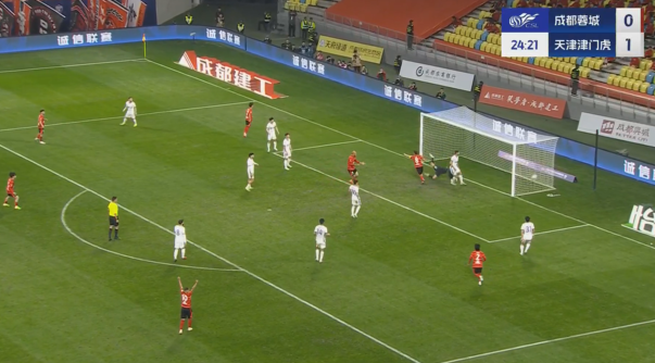03月02日讯 中超第二轮,成都蓉城vs天津津门虎,比赛第25分钟,胡荷韬精准传中送助攻,韦世豪高难度头球吊射破门,蓉城1-1扳平津门虎。