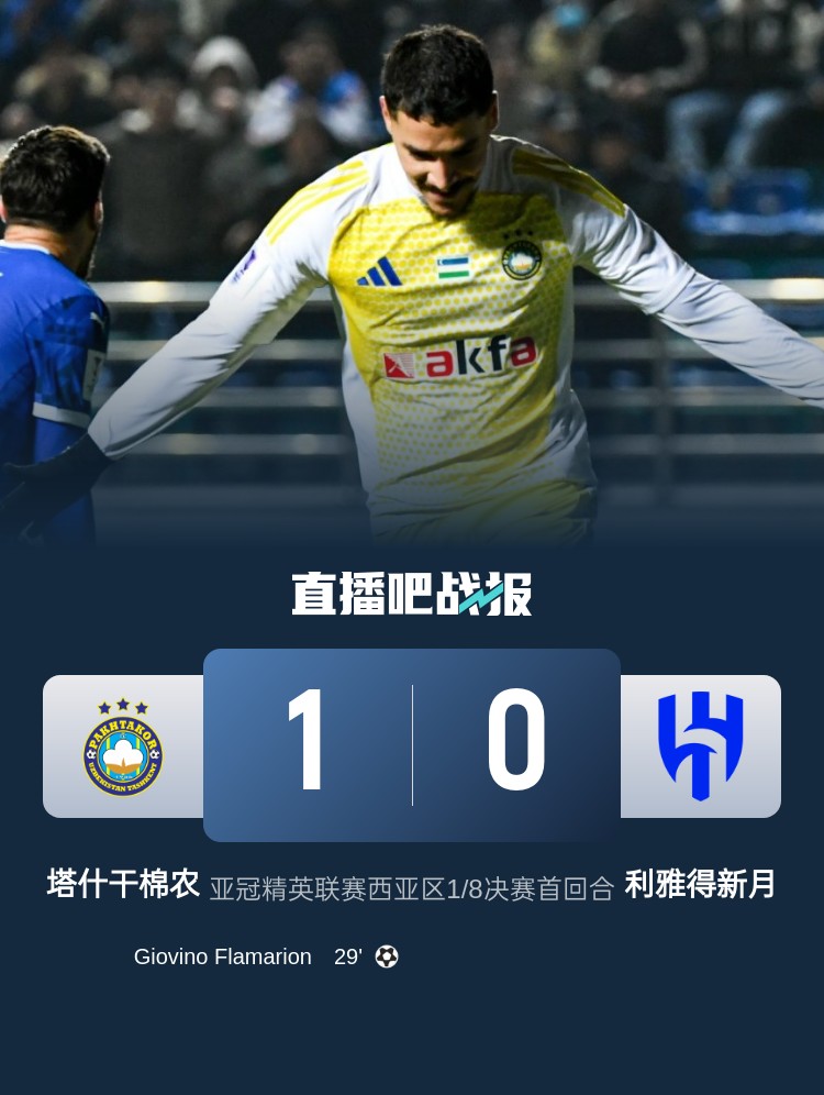 亚冠精英联赛西亚区1/8决赛首回合,利雅得新月首回合0-1塔什干棉农。上半场,弗拉马里昂撞射破门,布莱希伤退;下半场,米林科维奇错失良机,新月完成一次门线解围。