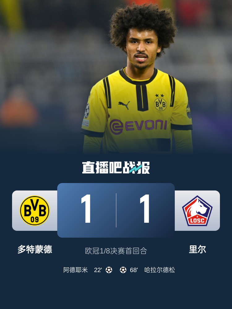 欧冠1/8决赛首回合,多特1-1里尔。上半场,阿德耶米造险+贴地斩破门,格罗斯进球被吹;下半场,哈拉尔德松扳平比分。