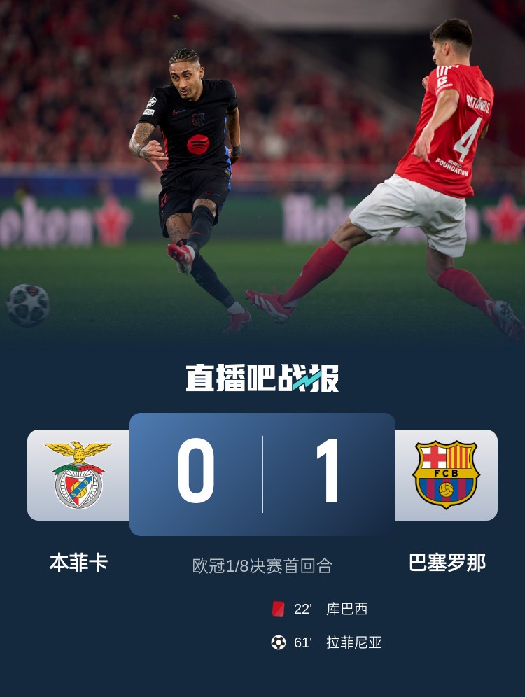 欧冠1/8决赛首回合,十人巴萨客场1-0本菲卡,库巴西直红,拉菲尼亚进球。