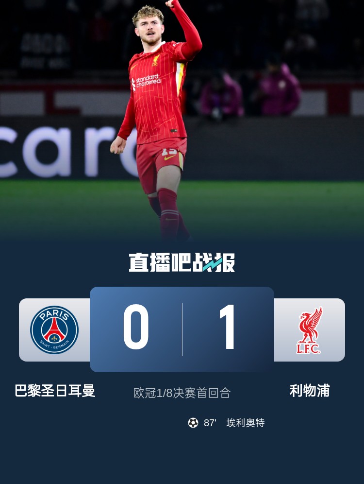 欧冠1/8决赛首回合,巴黎主场0-1遭利物浦绝杀,巴黎全场27次攻门一无所获,利物浦1脚射正就进球。
