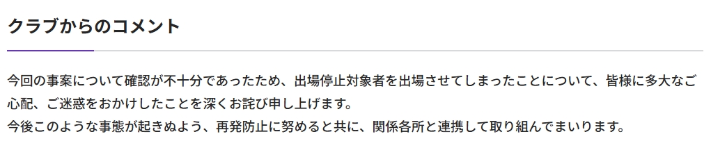 广岛三箭俱乐部官方写道:“由于我们对此事件调查不充分,导致被禁赛的球员仍然参赛,给大家带来了担忧与不便,我们深表歉意。