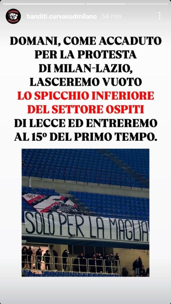 米兰南看台球迷组织在社交平台上宣布:“明天,就像米兰-拉齐奥时发生的抗议一样,我们将会在莱切球场客队坐区制造一片空场,我们将会从上半场第15分钟再进场。”