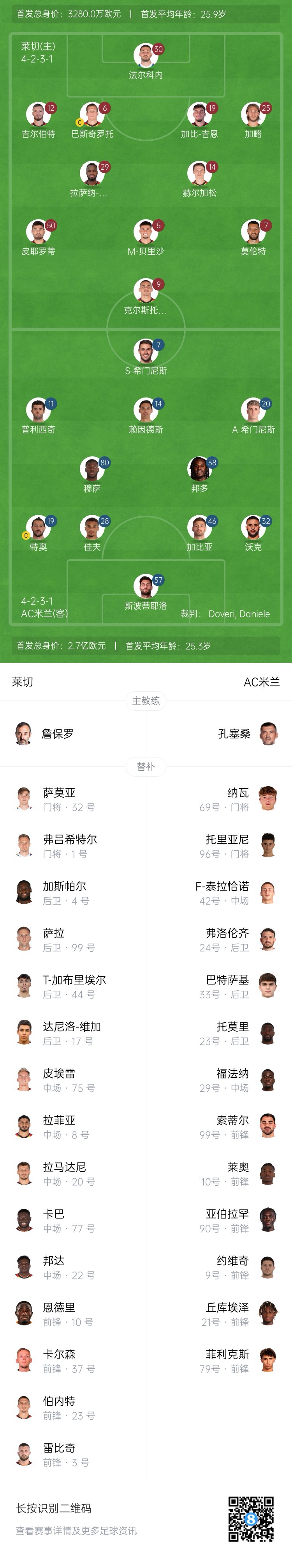米兰vs莱切首发:莱奥替补!邦多首秀,S-希门尼斯、美队出战