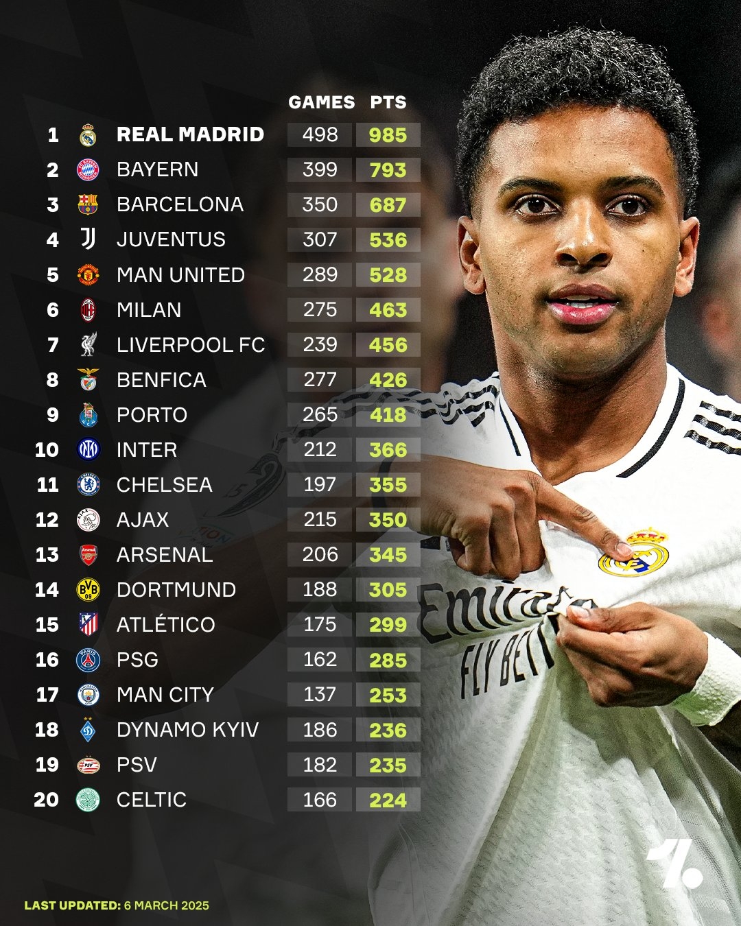 在OneFootball公布的欧冠历史积分榜上,皇马以498场比赛积985分的成绩高居榜首,拜仁399场积793分排在第二位,巴萨350场比赛687分位列第三。