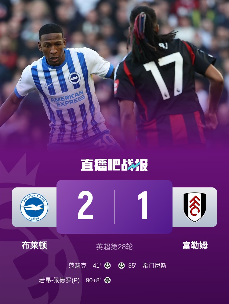 英超第28轮,布莱顿2-1逆转富勒姆。上半场,希门尼斯首开记录,伊沃比助攻,范赫克冒顶后将功补过扳平;下半场,三笘薰进球越位,佩德罗读秒造点+点射绝杀。