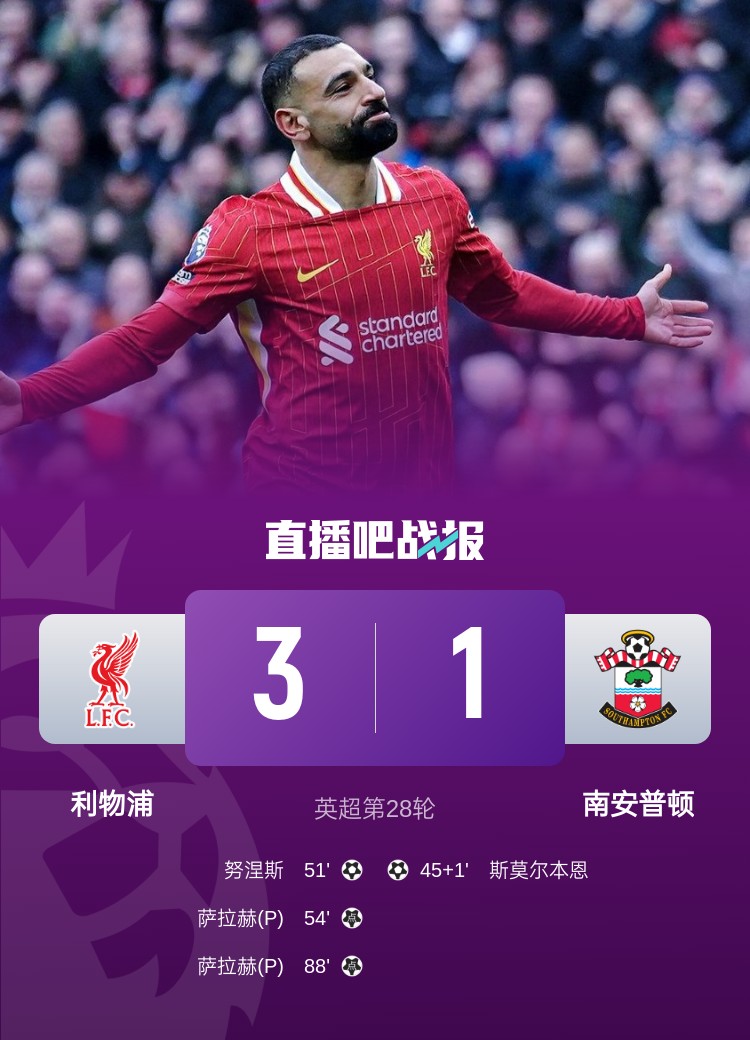 英超第28轮,利物浦3-1逆转南安普顿。上半场,利物浦防线出现失误,斯莫尔伯恩破门;下半场,努涅斯破门+造点,萨拉赫点射,菅原由势手球送点,萨拉赫点射再中。
