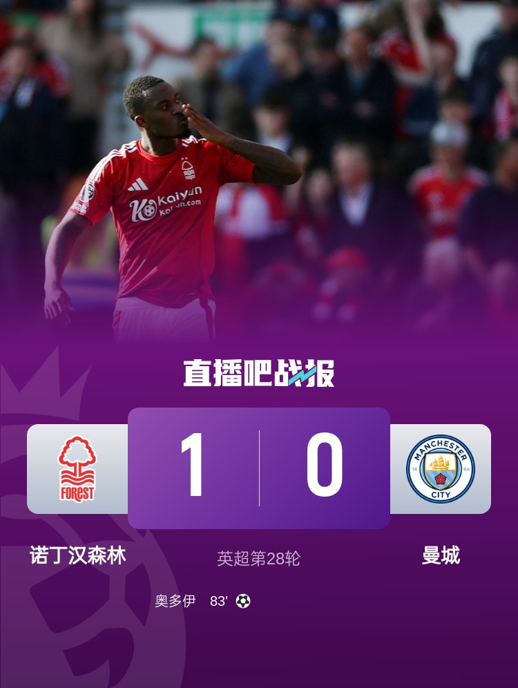 英超第28轮,曼城0-1不敌诺丁汉森林。上半场,冈萨雷斯远射中柱;下半场,奥多伊中柱,比赛尾声奥多伊爆射破门。