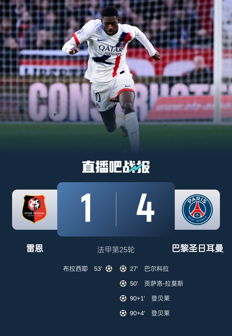 25轮不败!巴黎4-1雷恩先赛16分领跑 登贝莱替补补时3分钟双响