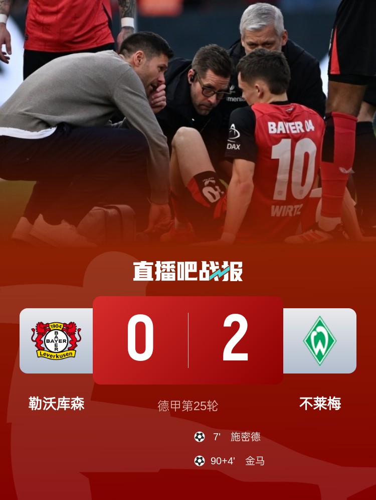 德甲第25轮,勒沃库森0-2不敌不莱梅,结束23轮不败。上半场,斯塔格助攻施密德破门,维利科维奇进球被吹越位,阿莱克斯-加西亚任意球中框;下半场,替补登场的维尔茨伤退,伯克打入一球被吹越位,金马锁定胜局。