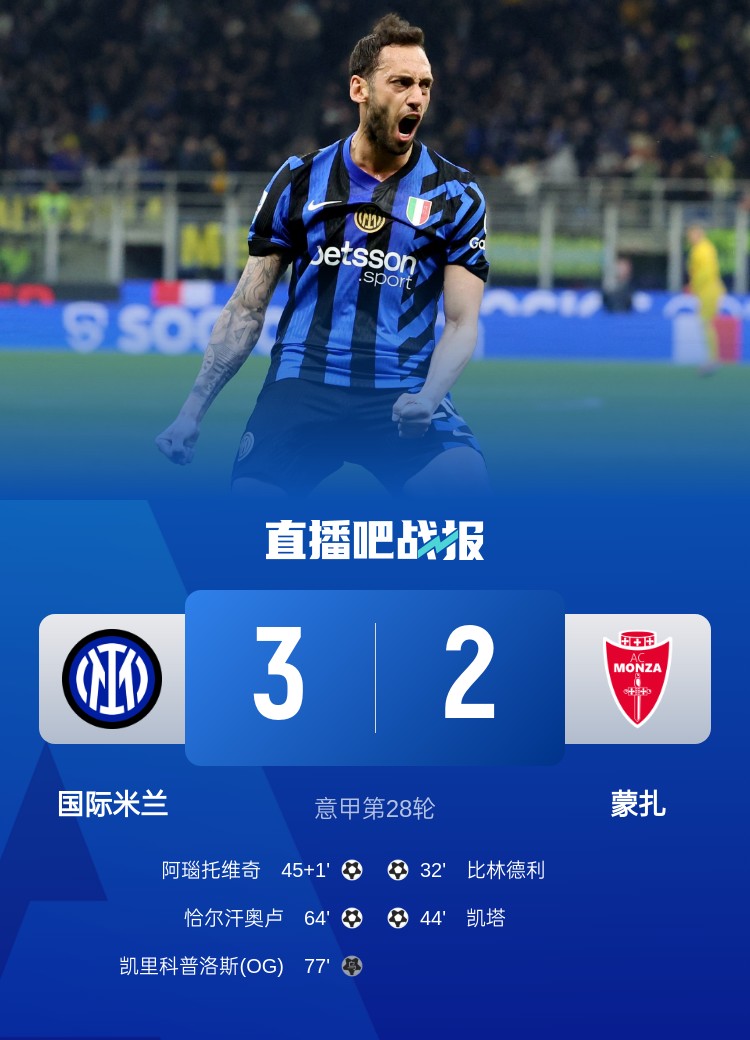 贴地斩扳平比分!官方:恰尔汗奥卢当选国米vs蒙扎全场最佳